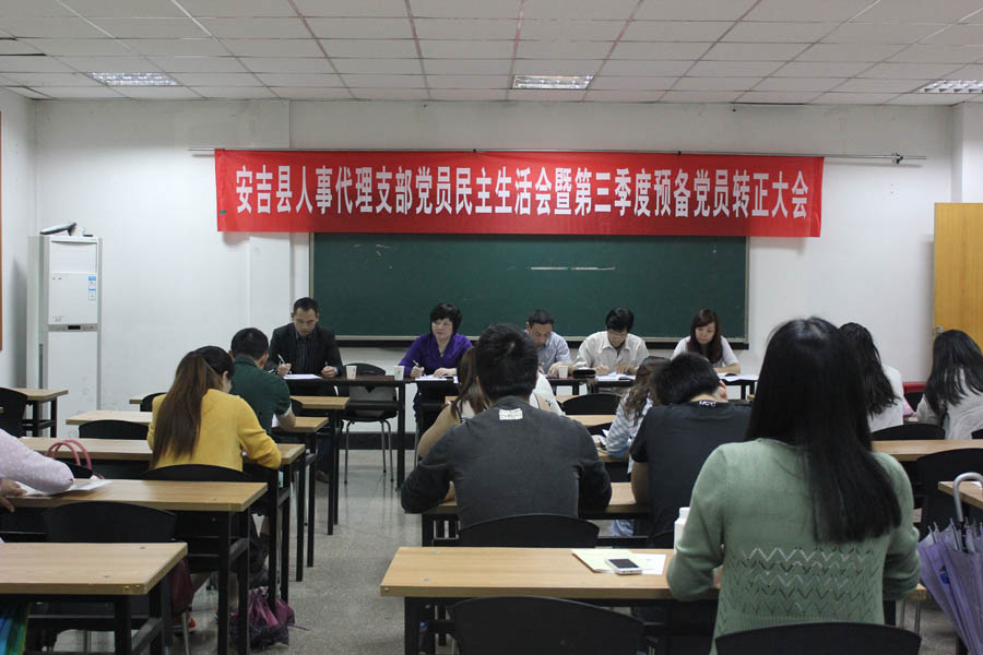 2014年9月19日下午,縣人事代理支部在安吉縣人力資源市場(chǎng)會(huì)議室召開了代理支部黨員組織生活會(huì)暨第三季度預(yù)備黨員轉(zhuǎn)正大會(huì),共有32名黨員參加了會(huì)議。